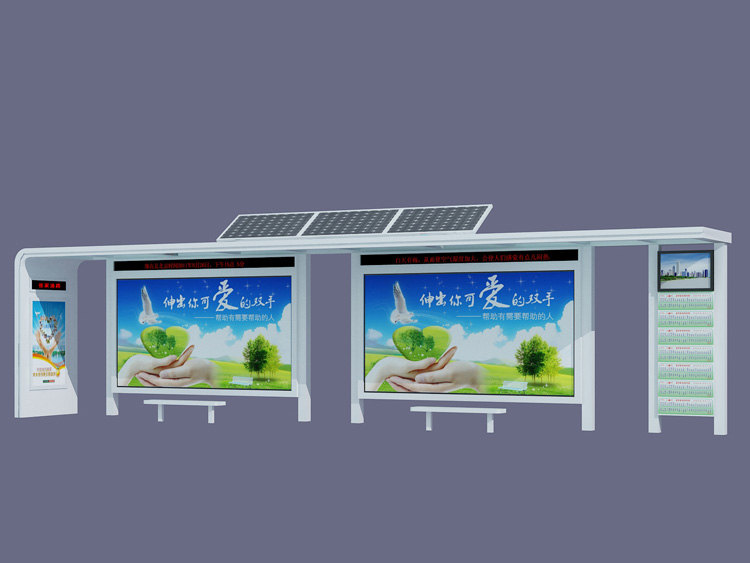 公交車候車亭一般是與公交站牌相配套的,為方便公交乘客候車時(shí)遮陽、防雨等,在車站、道路兩旁或綠化帶的港灣式公交停靠站上建設(shè)的交通設(shè)施。由于城市公交的日益發(fā)達(dá),候車亭已發(fā)展成為城市一個(gè)不可或缺的重要組成部分,設(shè)計(jì)精美的候車亭也成為了城市一道美麗的風(fēng)景。 一般候車亭棚體主要頂棚、立柱、頂弓、廣告燈箱和坐凳組成,也有用隔板來代替廣告燈箱的。