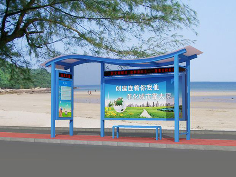 公交車候車亭一般是與公交站牌相配套的,為方便公交乘客候車時遮陽、防雨等,在車站、道路兩旁或綠化帶的港灣式公交?空旧辖ㄔO的交通設施。由于城市公交的日益發(fā)達,候車亭已發(fā)展成為城市一個不可或缺的重要組成部分,設計精美的候車亭也成為了城市一道美麗的風景。 一般候車亭棚體主要頂棚、立柱、頂弓、廣告燈箱和坐凳組成,也有用隔板來代替廣告燈箱的。