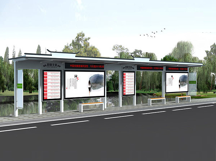 公交車候車亭一般是與公交站牌相配套的,為方便公交乘客候車時遮陽、防雨等,在車站、道路兩旁或綠化帶的港灣式公交?空旧辖ㄔO(shè)的交通設(shè)施。由于城市公交的日益發(fā)達,候車亭已發(fā)展成為城市一個不可或缺的重要組成部分,設(shè)計精美的候車亭也成為了城市一道美麗的風景。 一般候車亭棚體主要頂棚、立柱、頂弓、廣告燈箱和坐凳組成,也有用隔板來代替廣告燈箱的。