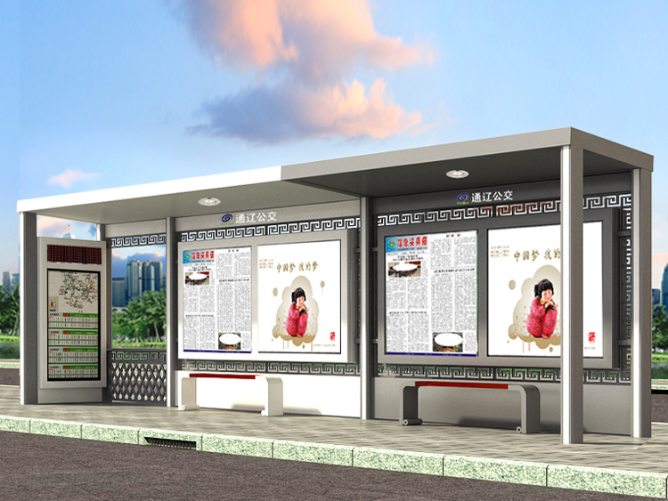 公交車候車亭一般是與公交站牌相配套的,為方便公交乘客候車時遮陽、防雨等,在車站、道路兩旁或綠化帶的港灣式公交?空旧辖ㄔO(shè)的交通設(shè)施。由于城市公交的日益發(fā)達,候車亭已發(fā)展成為城市一個不可或缺的重要組成部分,設(shè)計精美的候車亭也成為了城市一道美麗的風景。 一般候車亭棚體主要頂棚、立柱、頂弓、廣告燈箱和坐凳組成,也有用隔板來代替廣告燈箱的。